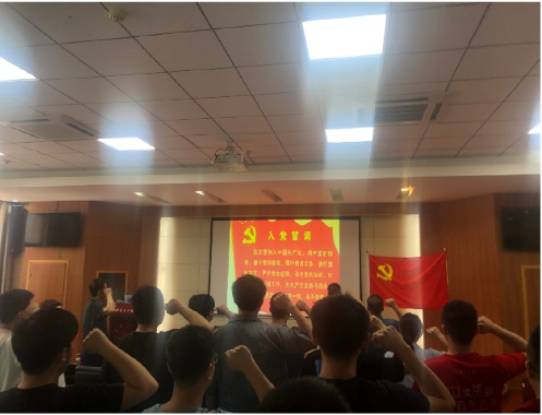 伴随着慷慨激昂的《国际歌》音乐,管延新宣读了参加本次入党宣誓活动的人员名单,全体与会人员面向党旗庄严宣誓。宣誓结束后,李文振要求各位预备党员,要认真学习党和国家的理论知识,充分认识党员的使命和责任;不忘初心,深刻理解“为人民服务”的根本宗旨,勇于站在人民立场上思考处理问题;发挥艰苦奋斗的精神,勇于创新,为实现中华民族伟大复兴贡献自己的力量;勇于担当,努力学习和工作,在日常学习生活中发挥党员先锋模范作用,无愧于共产党员的光荣称号。